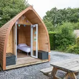 Inside you'll find beautifully decorated mid century modern styled living, kitchen and dining space, bathed in natural light from the expansive patio doors and windows. Relax after a day exploring everything Pembrokeshire has to offer in the cleverly sectioned living area, with two large comfortable sofas in front of the widescreen TV and sliding doors, giving access to the spacious private deck which overlooks the surrounding countryside.
