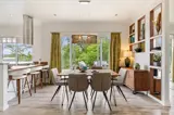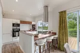 The bright and stylish kitchen provides an ideal space for preparing a delicious meal from local Pembrokeshire produce, with an eye level double oven, five burner hob, fridge/freezer and microwave, as well as a large floor to ceiling window for further views. Have a breezy brunch at the breakfast bar or a more formal event at the large dining table with plush upholstered seats under feature pendant lighting in front of the generously sized sliding French doors - your main entryway to the extensive private deck and yet another viewpoint for the nature and wildlife beyond the glass balustrades.