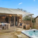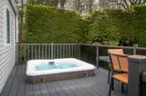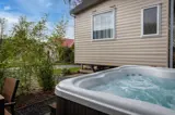 Outside you'll find your hot tub as well as an outdoor table and chairs.