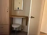 The twin bedroom has its own feature upholstered headboard as well as central bedside cabinet, wardrobe and dressing table, sharing the family shower room.