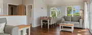 Inside you'll find a large living area which boasts a wide screen TV, two sofas and coffee table alongside large French doors that provide uninterrupted views of the adjoining fields, as well as the hedgerow which is a haven for small birds. A great place to relax after a long day exploring Pembrokeshire.