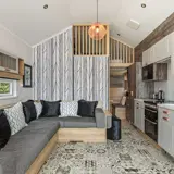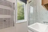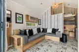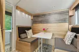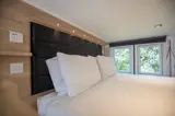 The rear dining area has seating for four around a freestanding table. At night, the space transforms for sleeping via a wall mounted pull-down double bed. Above the dining area is an upper bunk level which can be made up into a double or twin beds, featuring an access ladder, two 230V sockets, USB points and rear ventilation windows. You'll also find a family shower room downstairs.