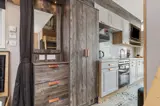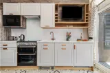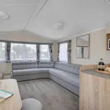 The open plan living and kitchen area makes a stylish statement. A large fixed L-shape sofa with scatter cushions offers plenty of room for everyone to relax in front of the wall mounted TV. The well equipped kitchen is great for the chef in the group, with a long worktop surface and quality appliances including a full size cooker, under counter fridge with freezer box, integrated microwave and domestic style sink bowl with drainer - everything you need for preparing a scrumptious meal with local Pembrokeshire produce.