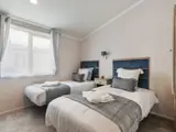 The twin bedroom boasts two 3ft wide beds with Aurora Duvalay™ mattresses, padded headboards, reading lights, double wardrobe with drawers and its own vanity area with mirror, shelf, socket and cube stool.